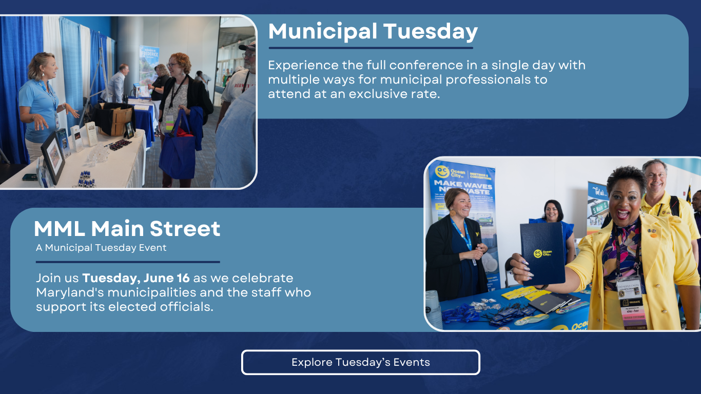 We have been alerted to possible fraudulent activity by individuals falsely claiming to represent the Maryland Municipal League (MML). These individuals offer hotel bookings, exhibitor services, and/or attendee lists. Please disregard any such calls or emails. The Maryland Municipal League has partnered exclusively with Conference Direct for featured hotel reservations and ARATA for expo management. No other third-party organizations represent our services or events.